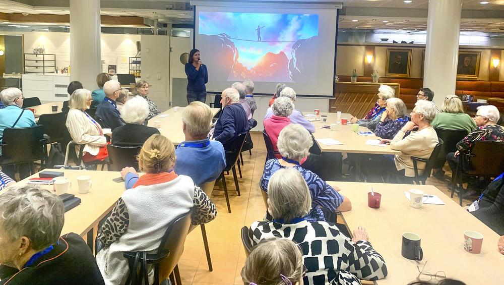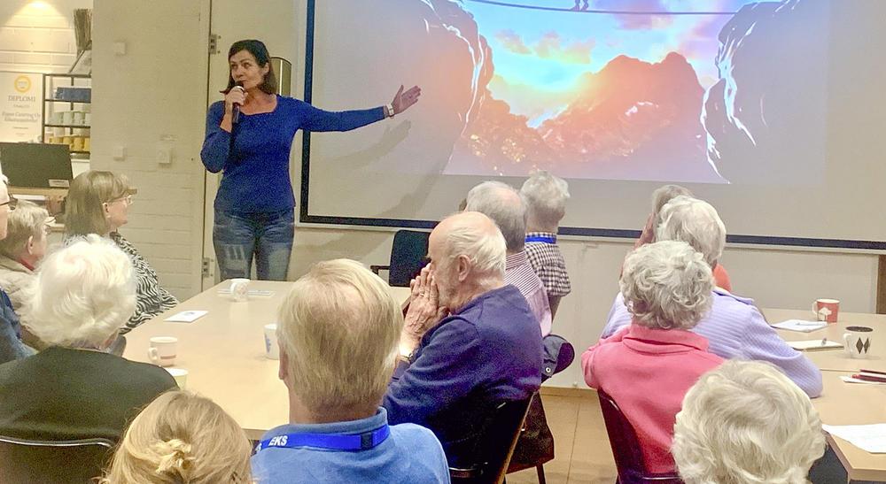 Liikuntatieteiden maisteri Eija Holmala avasi esityksensä nuorallatanssijan kuvalla. Jäsenistöstä kuului jo huokauksia, mutta viesti oli vahva. Tasapainoa kannattaa ja tulee harjoittaa, jotta meille ikääntyneille usein suuria hankaluuksia aiheuttavia kaatumisia voidaan ehkäistä. Holmala listasi asioita, joilla on vaikutusta tasapainokykyyn. Alentunut näkö- ja kuuloaisti, lääkitys, alkoholi ja jopa ravitsemus saattavat vaikuttaa tasapainon ylläpitämiseen.