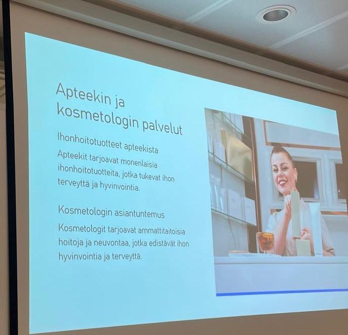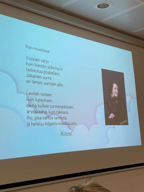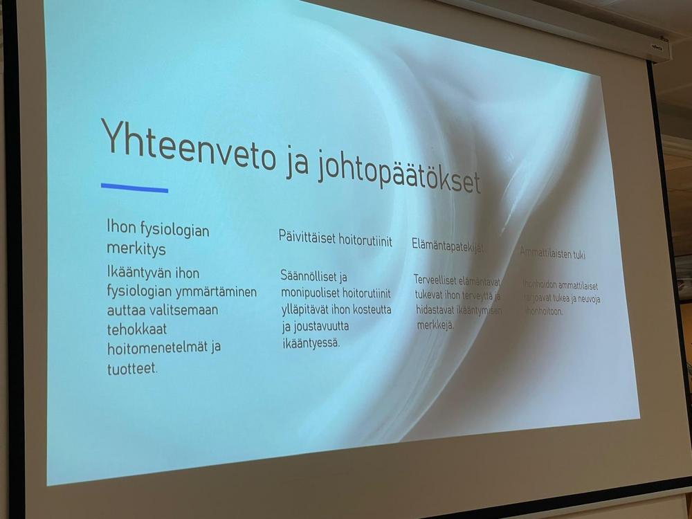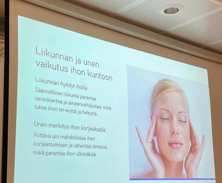 Lopuksi Autio kehotti hyödyntämään ammattilaisten apua oikeiden ihonhoitotuotteiden valinnassa. Siihen saa apua apteekeista ja kosmetologeilta. Lopuksi hän lausui kauniin runon, Ihon muistissa.