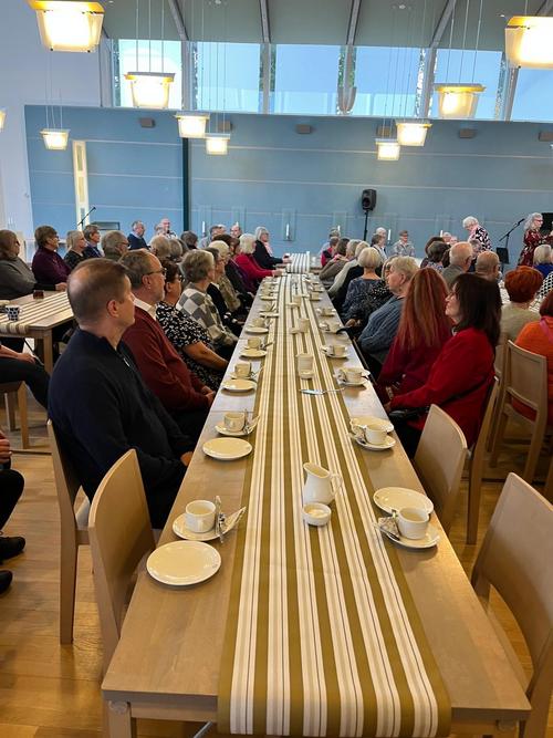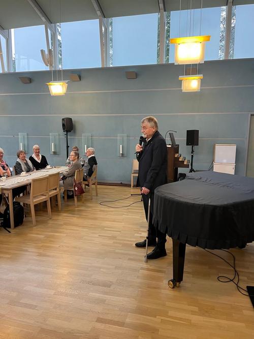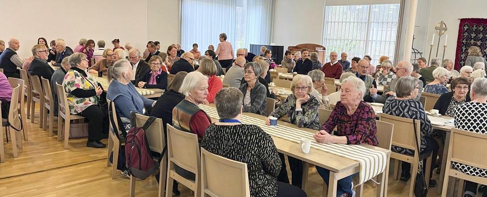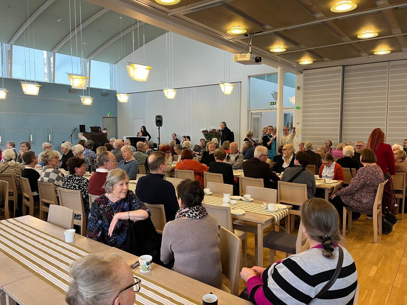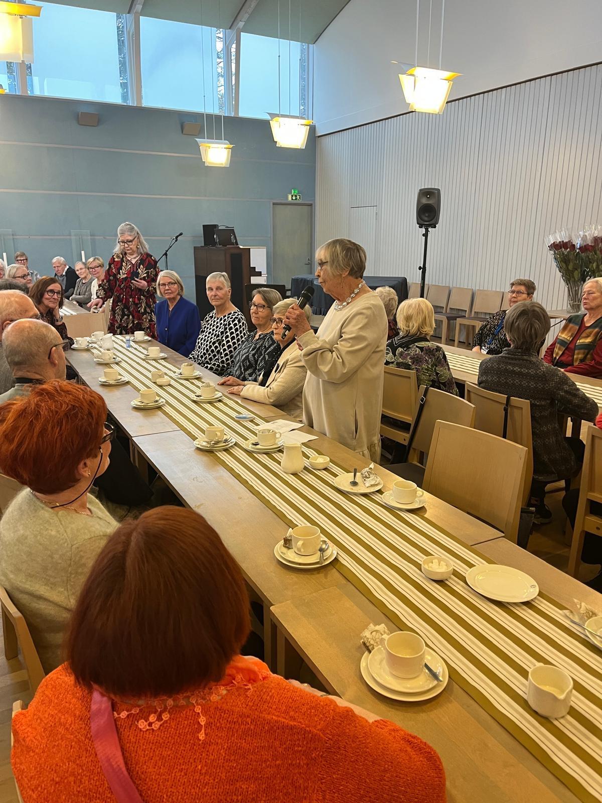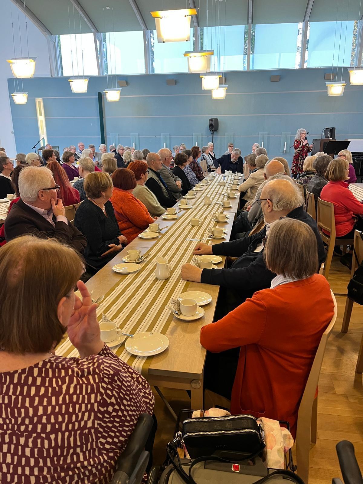 Komeat puitteet saatiin synttärijuhlaamme tiistaina 28.10.2025 kun Valtuustotalon kahvion remontin johdosta siirsimme jäsentapaamisen Tuomiokirkon Seurakuntatalolle. Logistiset haasteet tietysti seurasivat mukana, mutta lopulta kaikki sujui hienosti. Jäsenemmekään eivät oudoksuneet paikanvaihtoa vaan saapuivat lähes 140 hengen voimin synttäreitä juhlimaan.