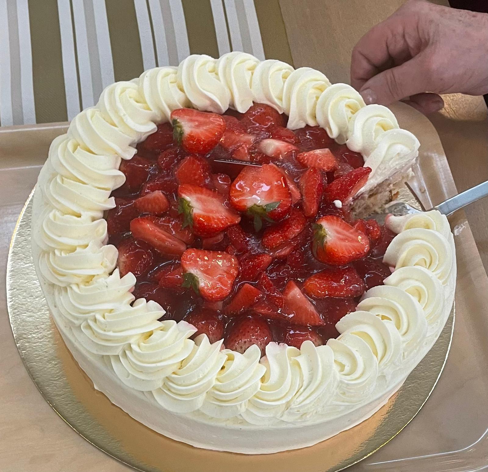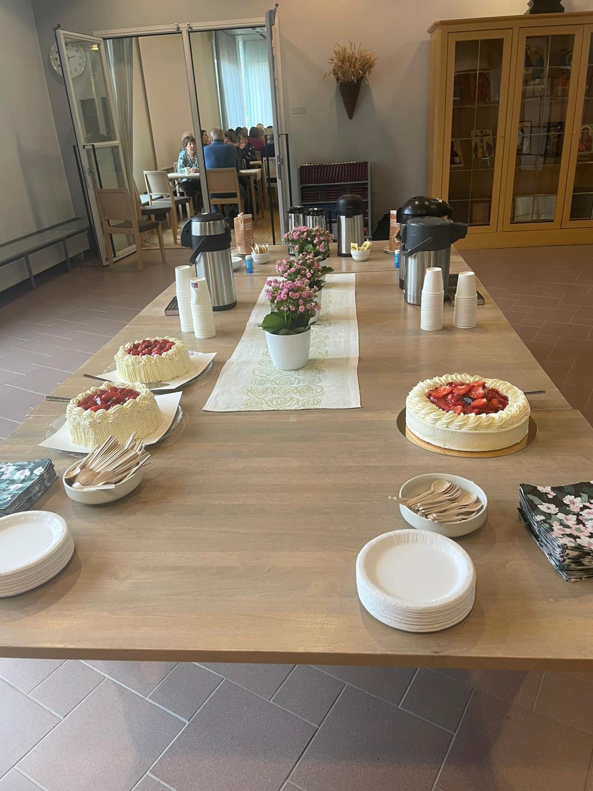 Juhlatoimikunta oli hoitanut kakkutilauksen ja ohjelmallisen osuuden. Heidän ansiostaan ja muutaman lisävahvistuksen voimin kakkukahvit saatiin tarjoiltua juhlavieraille pöytiin, muiden noutaessa ne kahvibuffetista. Lisäjännitystä toimikunnan jäsenille toi runsas osanotto. Olimme varanneet kakkua 120 hengelle ja epäilimme tokko niinkään moni paikalle saapuu. Yllätitte meidät iloisesti ja kakkukin saatiin riittämään toimikunnan jäsenten kekseliäisyyden ja ripeän toiminnan avulla.