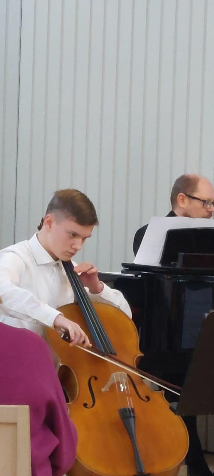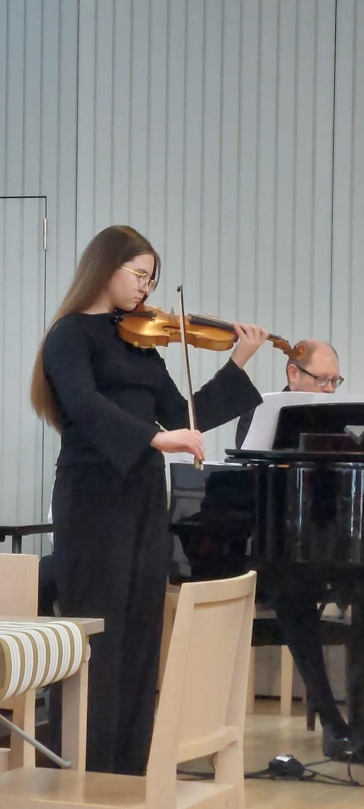 Juhla jatkui Avonian oppilaiden esityksillä, viulisti Vivien Janhunen soitti ensin W.A. Mozart Concerto in A Major No. 5 1st Movement ja sen jälkeen Sibeliuksen Romance Op. 78 No. 2. Hänen jälkeensä Veikka Joensuu soitti kappaleet S. Rahmaninov – Vocalise, E. Elgar - Salut d´Amour Op. 12 ja E. Sohlström – Elegia. Saimme näin nauttia kauniisti tilassa soivista jousisoittimista ja lahjakkaista oppilaista. Kumpaakin soittajaa säesti pianolla opettaja Esa Ylivaara.