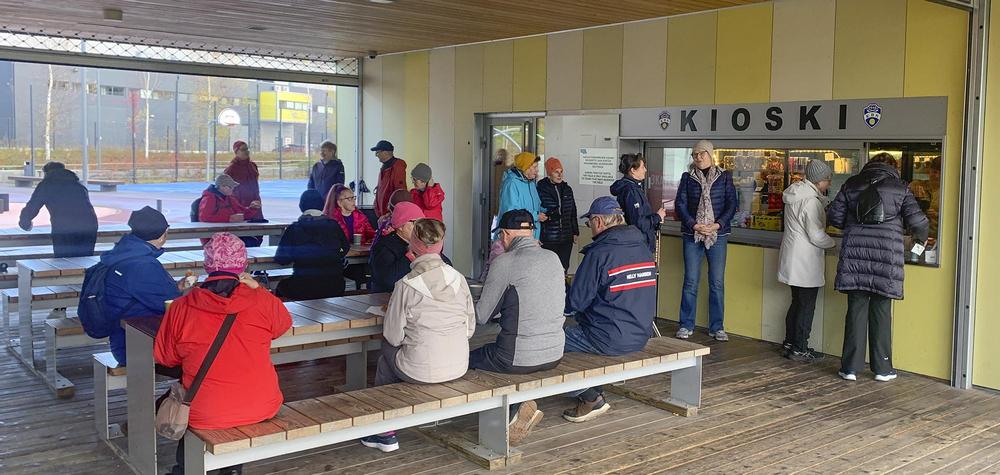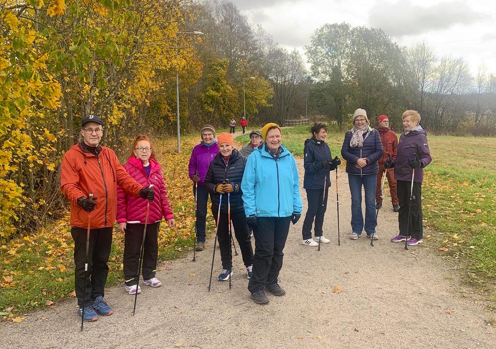 Liikuntaseniorimme Matti Alavuon ideoima kävely/sauvakävelytapahtuma järjestettiin raikkaassa syyssäässä 16.10.2025 klo 14 alkaen. Kokoontumispaikkana oli Keski-Espoon Urheilupuisto, josta 25 osallistujaa starttasi yhteiselle lenkille. Lyhyen alkujumpan jälkeen käänsimme nokat kohti pohjoista ja annoimme sauvoille vauhtia. Reitiksi valittiin tällä kertaa tasamaata, jotta jokaisella olisi mahdollisuus olla mukana. Suunnitelmana oli kävellä 25 minuuttia ja kääntyä sen jälkeen takaisin samaa reittiä. Kauaimmaiseksi kohdaksi osui Ikean viereinen puisto, jossa otimme ryhmäkuvat todisteeksi reippailustamme. Paluumatka sujuikin jo lämmennelle kropalle sujuvammin, ja ehkä askelta kevensi myös tietoa perillä odottavista pullakahveista.
