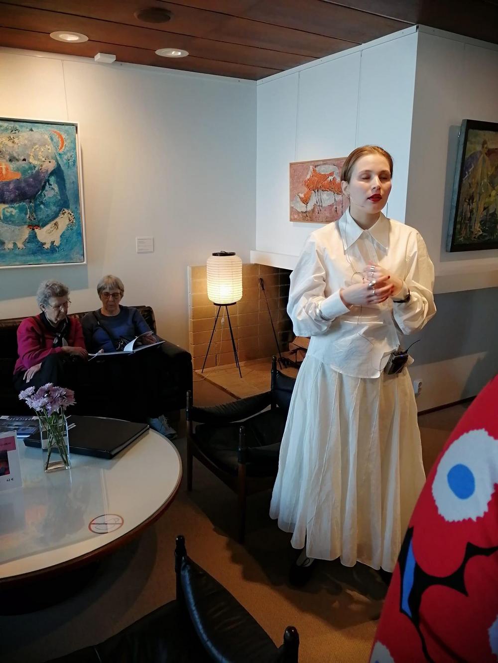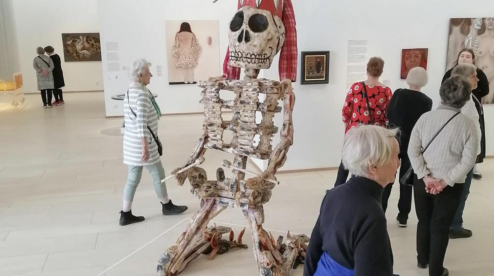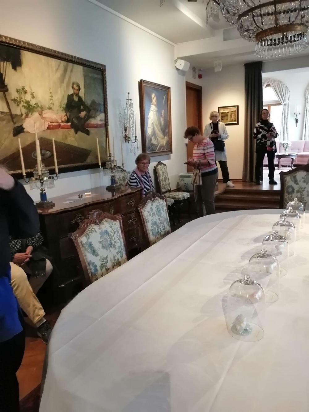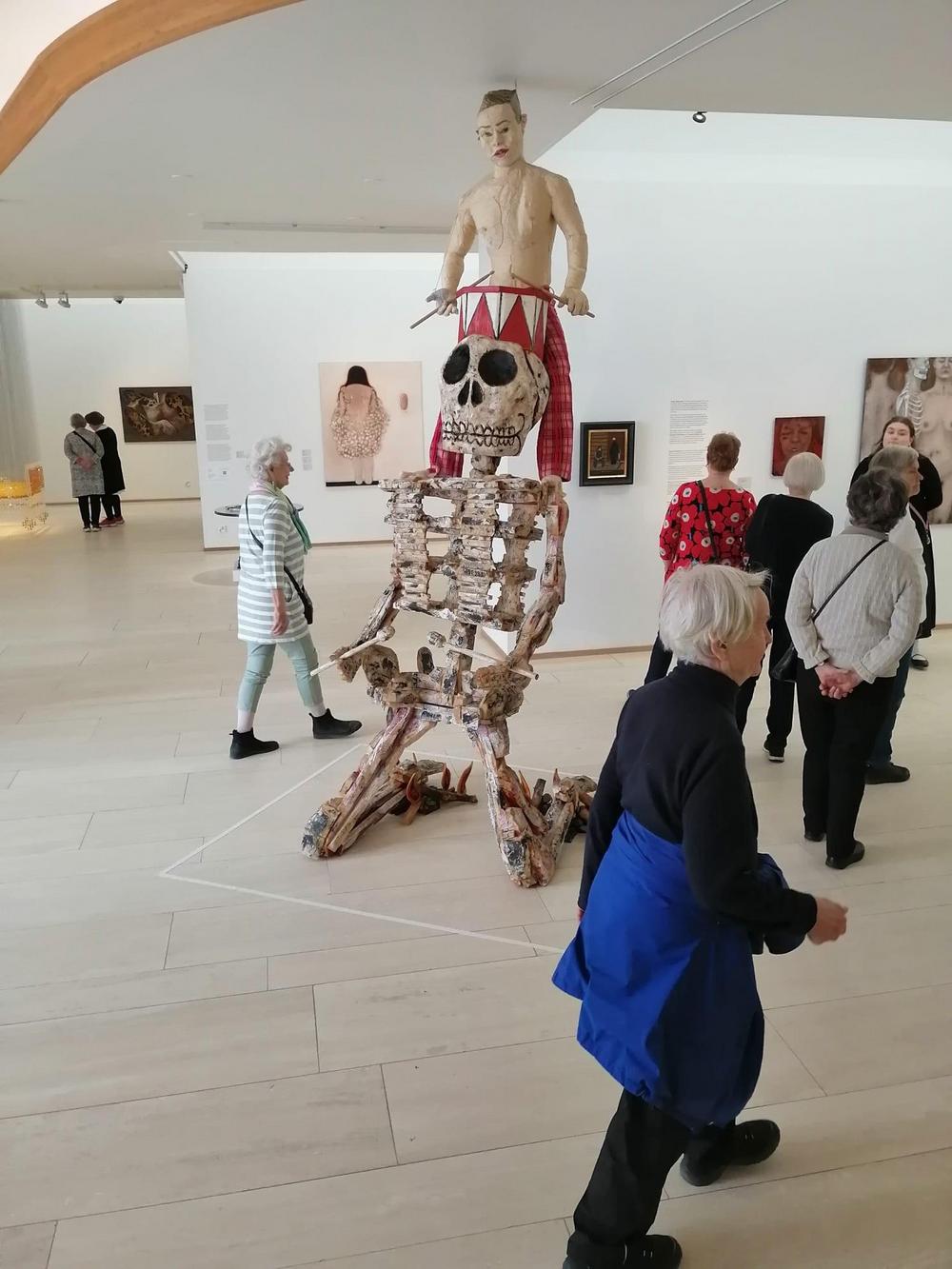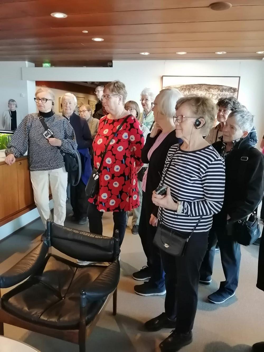 Vihdoin koitti kauan odotettu retki Didrichsenin ja Gyllenbergin taidemuseoihin. Bussillinen keskiespoolaisia senioreita suuntasi kohti Kuusisaarta. Koska ohjelmassa oli kaksi kohdetta, jouduttiin retkeläiset jakamaan kahteen osaan. Helenan johdolla ensimmäinen ryhmä tutustui Reidar Särestöniemen 100 vuotisjuhlanäyttelyyn ja Paula johdatti toisen ryhmän Morbus näyttelyyn. Opastettujen kierrosten jälkeen vaihdettiin kohteita.
