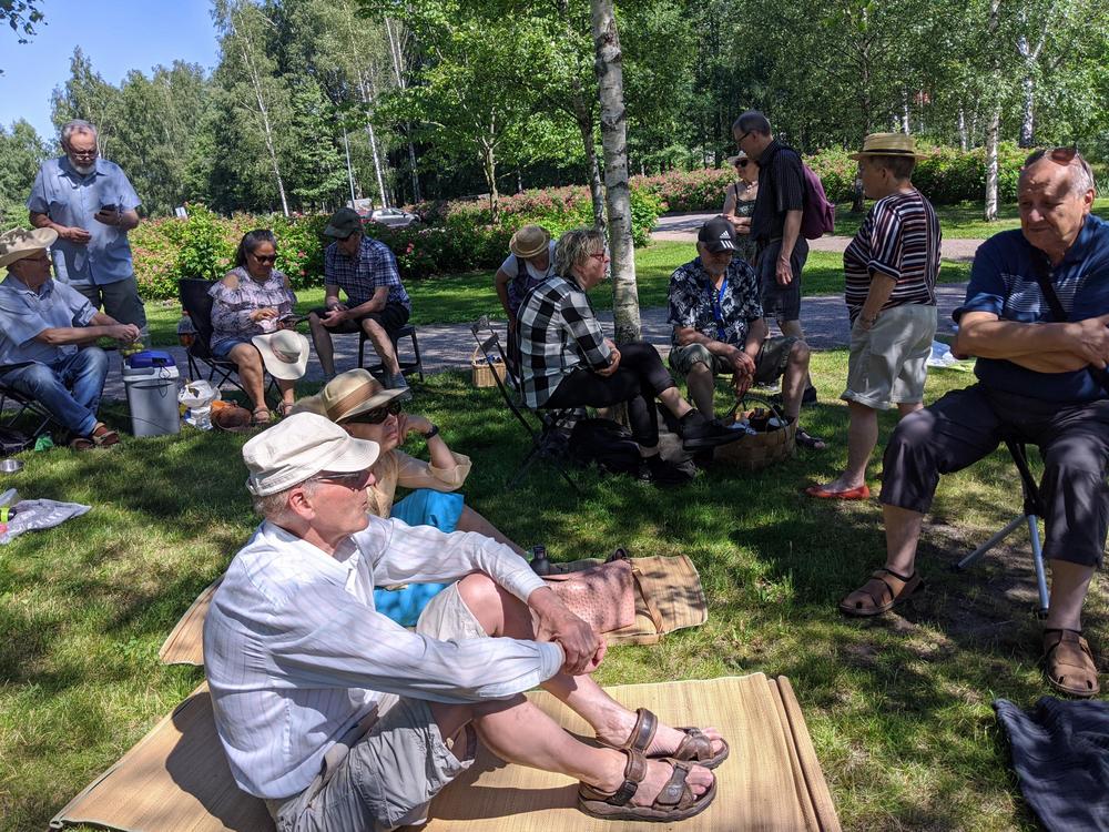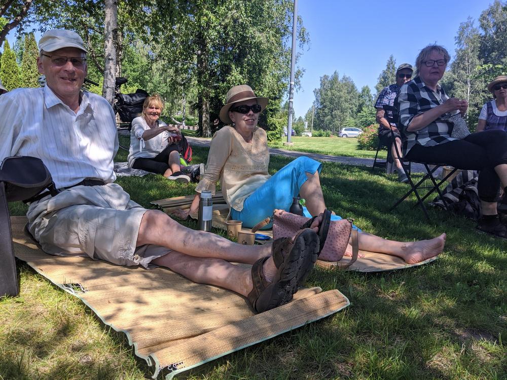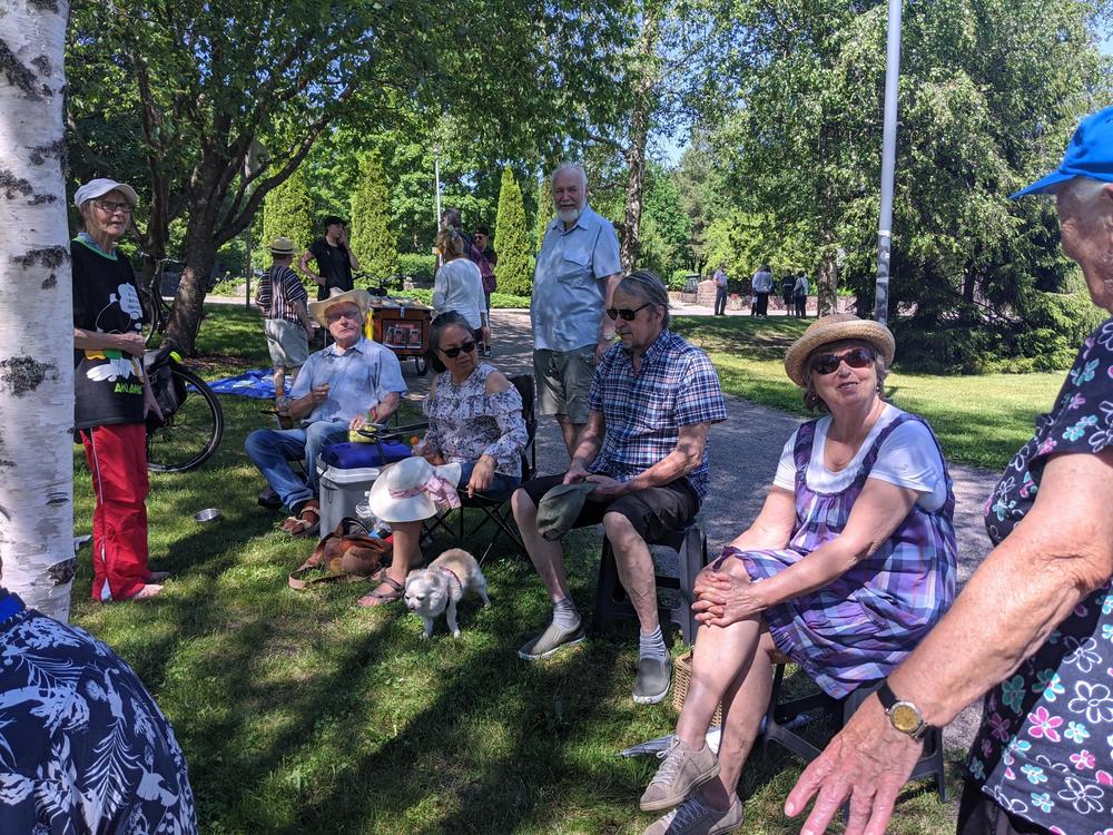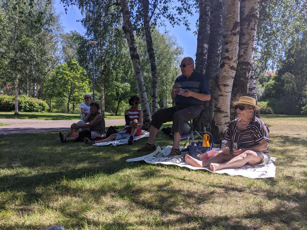 25.6. pitkän koronakevään jälkeen pääsimme tapaamaan senioriystäviä puistopiknikin merkeissä Espoon tuomiokirkon puistossa.