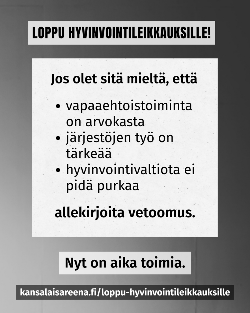 Allekirjoita vetoomus, klikkaa kuvaa ja osoita tukesi hyvinvointivaltiolle ja kansalaisyhteiskunnalle.
