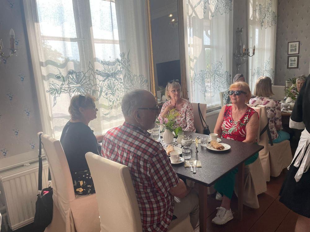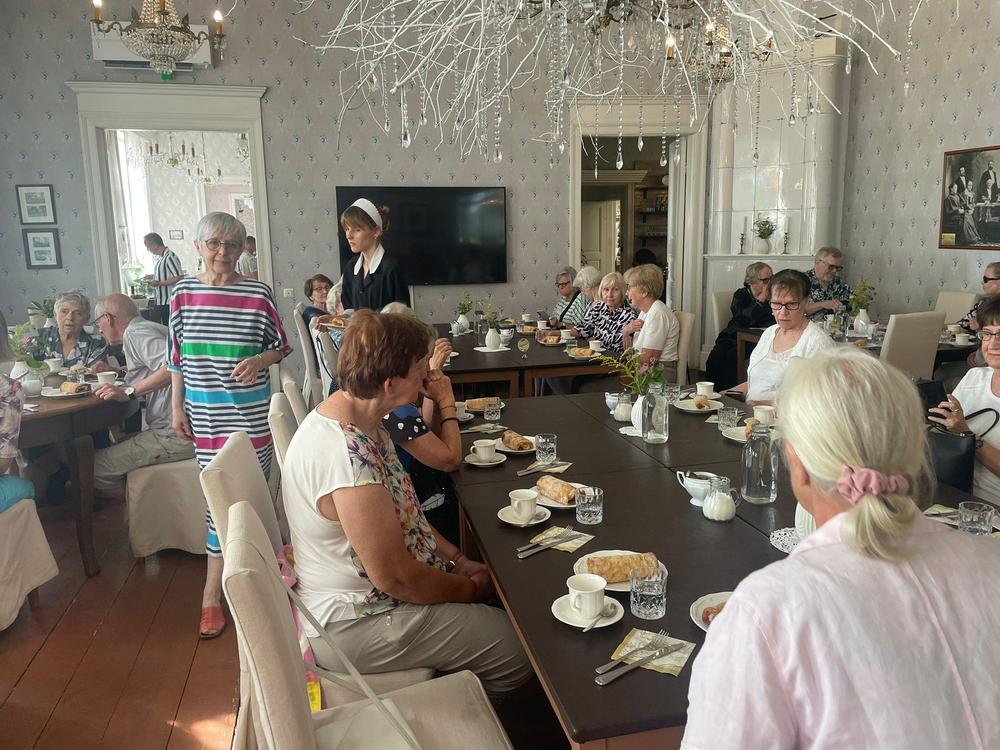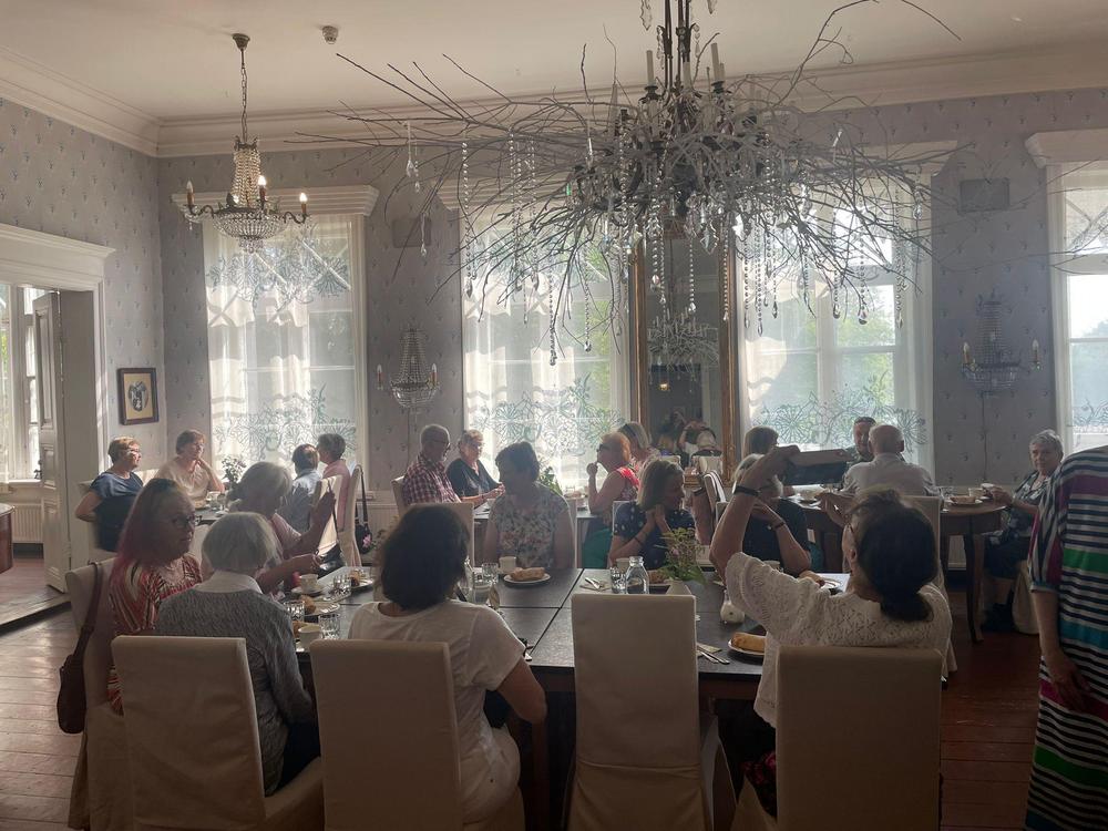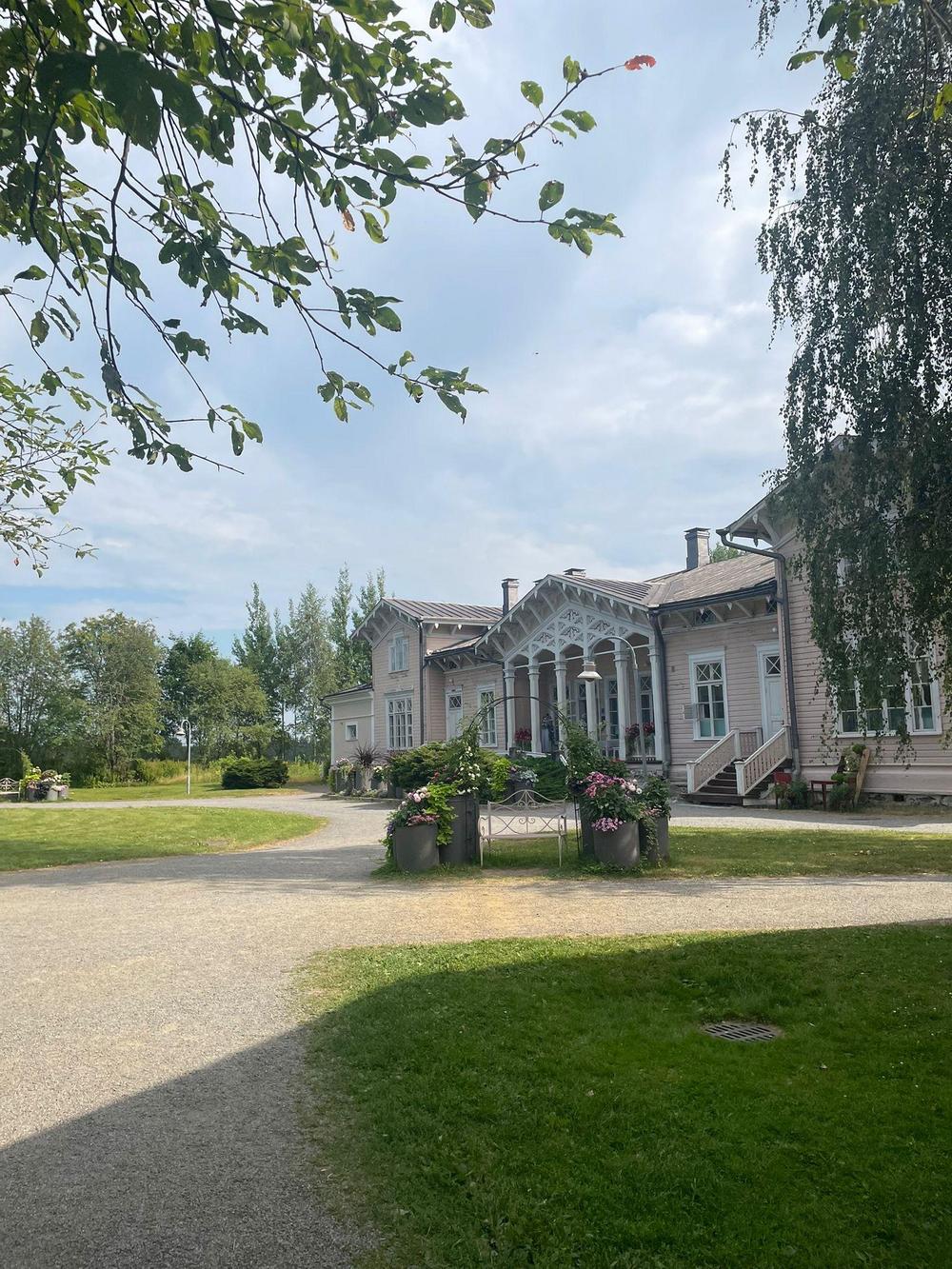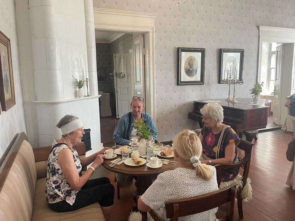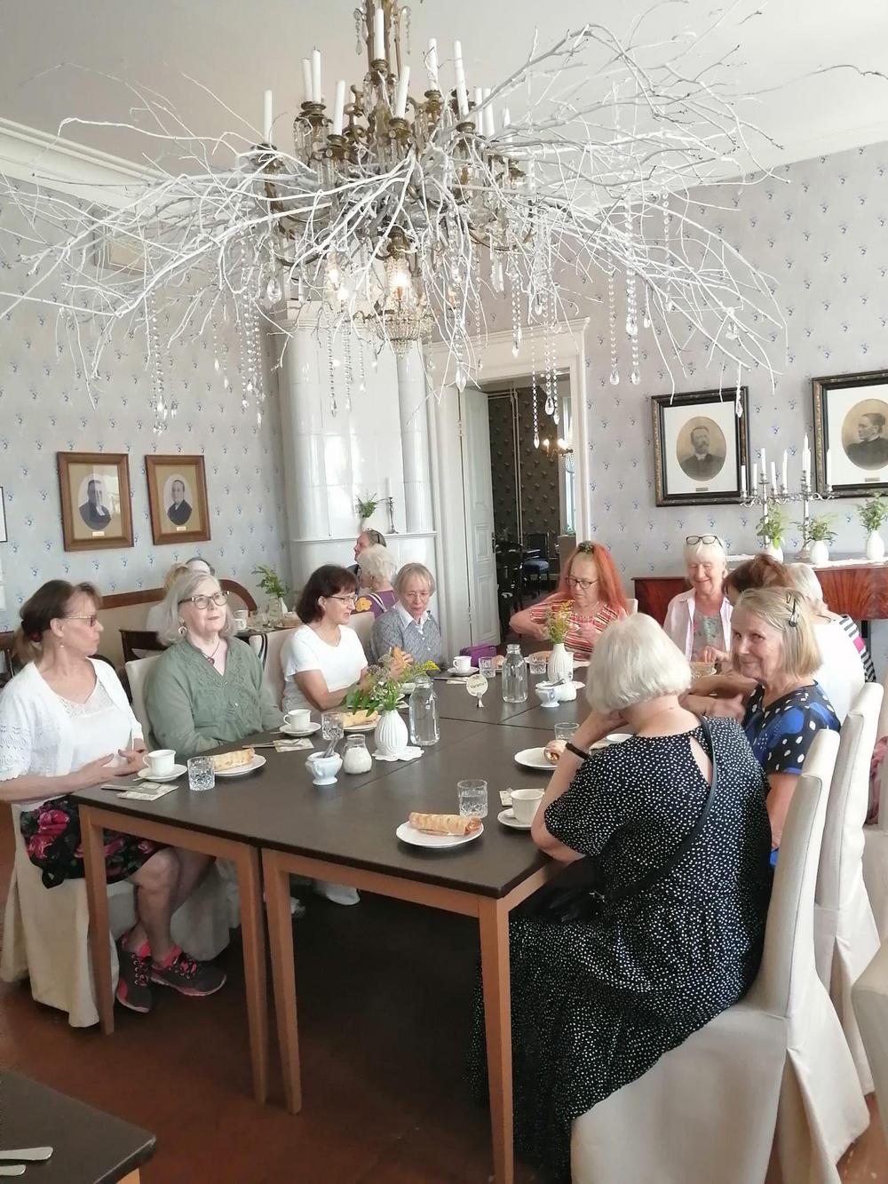 Ensimmäinen kohde oli kahvitauko Kenkäverossa Mikkelissä. Kenkäveron Pappilan upea pitsikoristeinen päärakennus on palvellut yli 150 vuotta useita kirkkoherroja perheineen. Se on ollut henkisen ja alueellisen hyvinvoinnin keskus. Monelle paikkakuntalaiselle varhaisimmat muistot liittyvät kuulutuksiin ja virkatodistuksiin. Kenkäverossa on pidetty juhlia, syntymä- ja nimipäiviä. Se toimii nykyisin mm. ravintolana ja juhlatilana. Meille oli katettu pöydät koreaksi. Tarjolla oli kahvia ja rieskarulla, hyvältä maistui. Aikaa jäi vielä tutustua kauniiseen alueeseen ja jättää ”turistirahaa” eli tehdä ostoksia alueen putiikeissa.