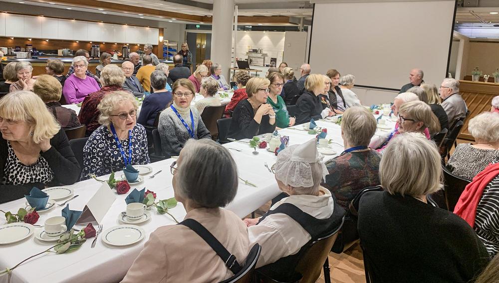 Mervi Kataisen espoolaisia kiinnostaneen esityksen jälkeen oli aikaa muutamalle kysymykselle, ennen kuin päästiin kakkukahvien kimppuun. Kakkua oli tilattu 120 hengelle ja mistä lie kristallipallosta tilaisuuden järjestäjät sen tiesivät, sillä juuri se määrä jäseniä paikalle saapui. Synttärisankareille kakkukahvit tarjoiltiin pöytiin.