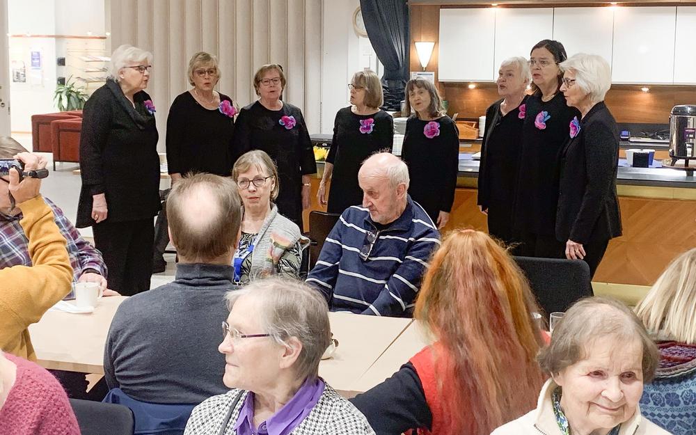 Vilkkaan puheensorinan sai hiljenemään kaksi upeaa esitystä. Laulukuoro Ellit esitti kolme moniäänistä kappaletta saaden isot aplodit. Hyvän vastaanoton sai myös runoja lausunut Ritva Törnvall, jonka runoista moni jäsenemme tunnisti varmaan itsensä.