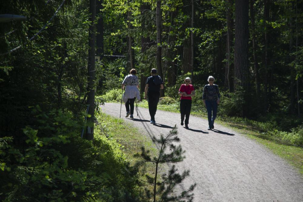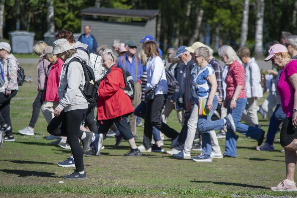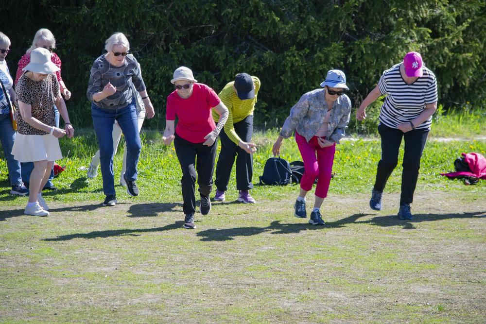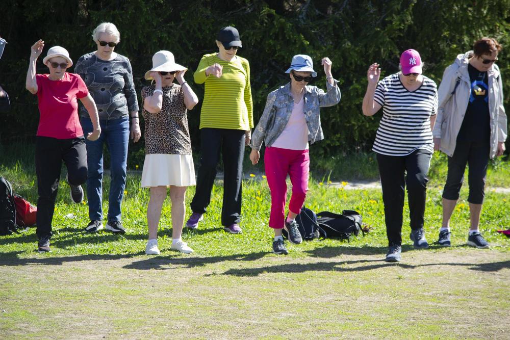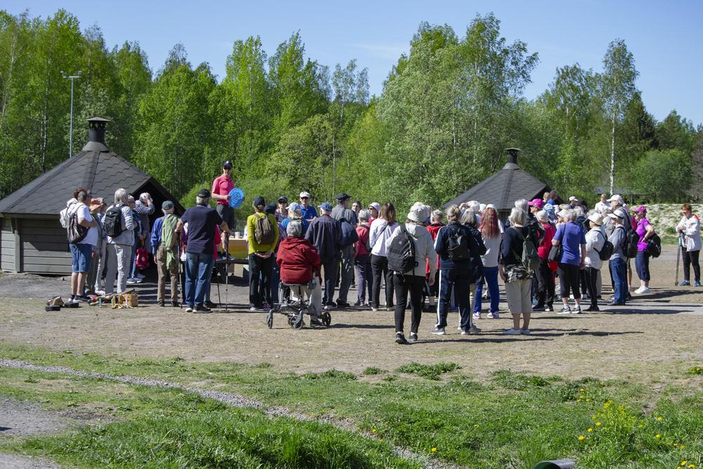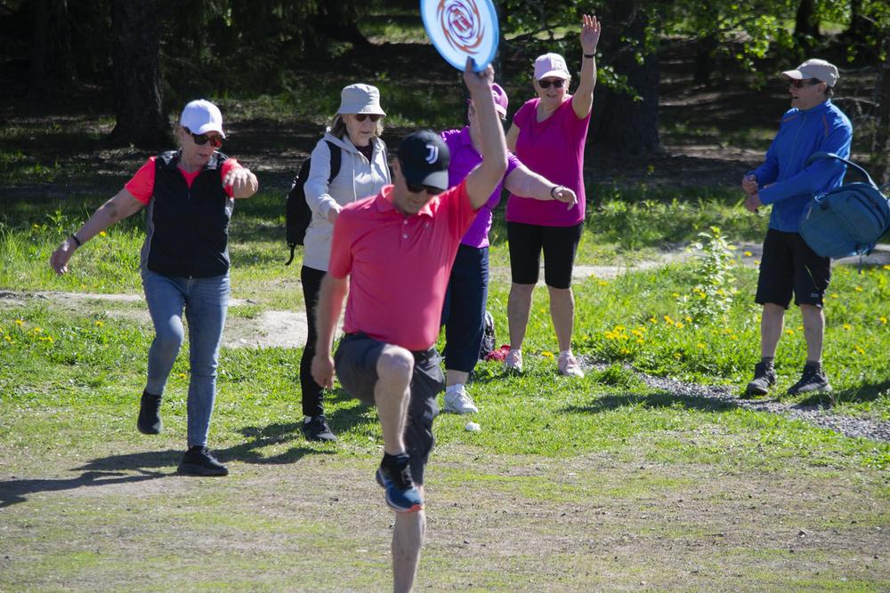 Yhdistyksen liikuntavastaava, Matti Alavuo oli suunnitellut ulkoilupäivään monenlaisia aktiviteetteja ja komea aloitus oli, kun lähes satapäinen seniorijoukko teki alkulämmittelyn Matin ohjeistamana. Vielä nousee jalka ja kiertyy kroppa vaikka vuosia on paljon takana. Hyvällä asenteella jatkettiin alkulämmittelyn jälkeen, osa halusi kävelylenkille upealle metsäreitille, osa pelasi mölkkyä, toiset petankkia. Itse pääsin ensimmäistä kertaa kokeilemaan frisbeegolfia, joka onkin jo jonkin aikaa vetänyt puoleensa.