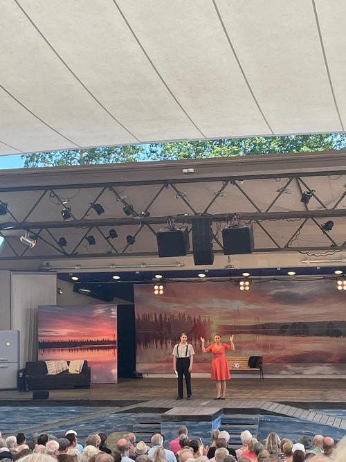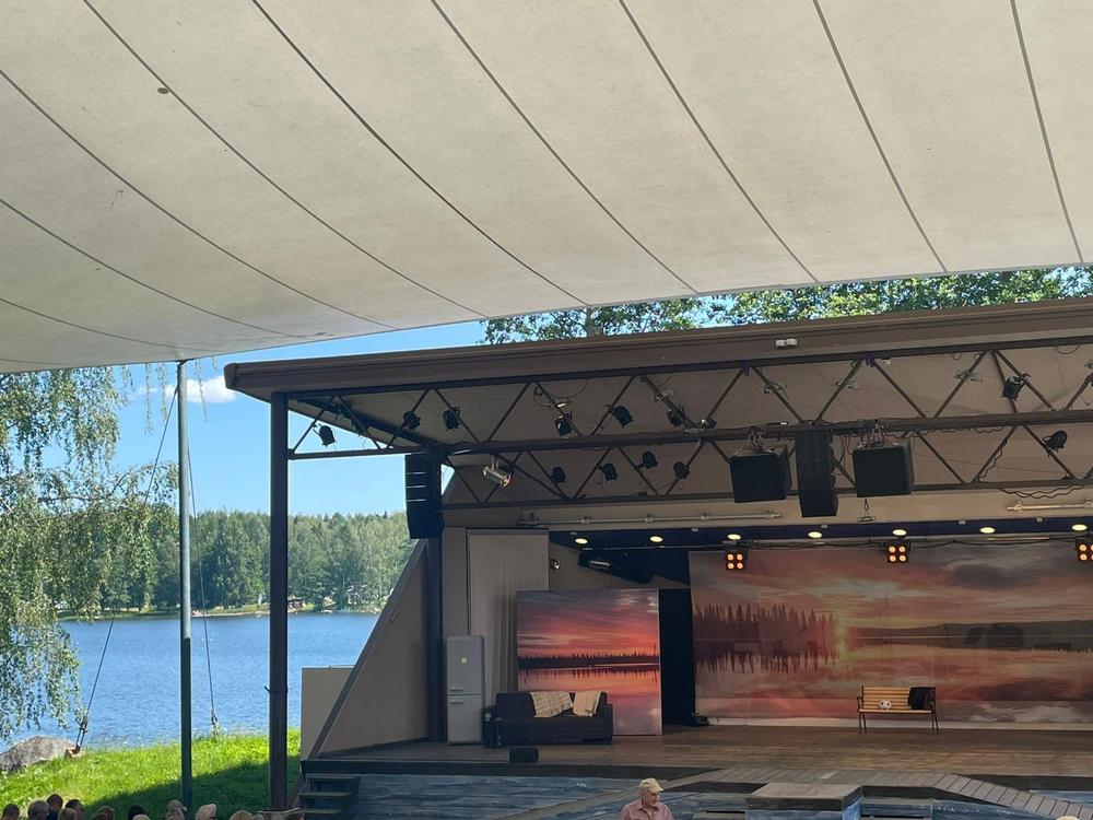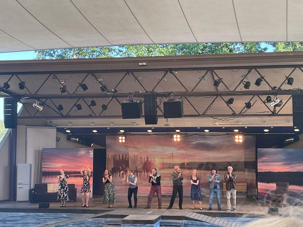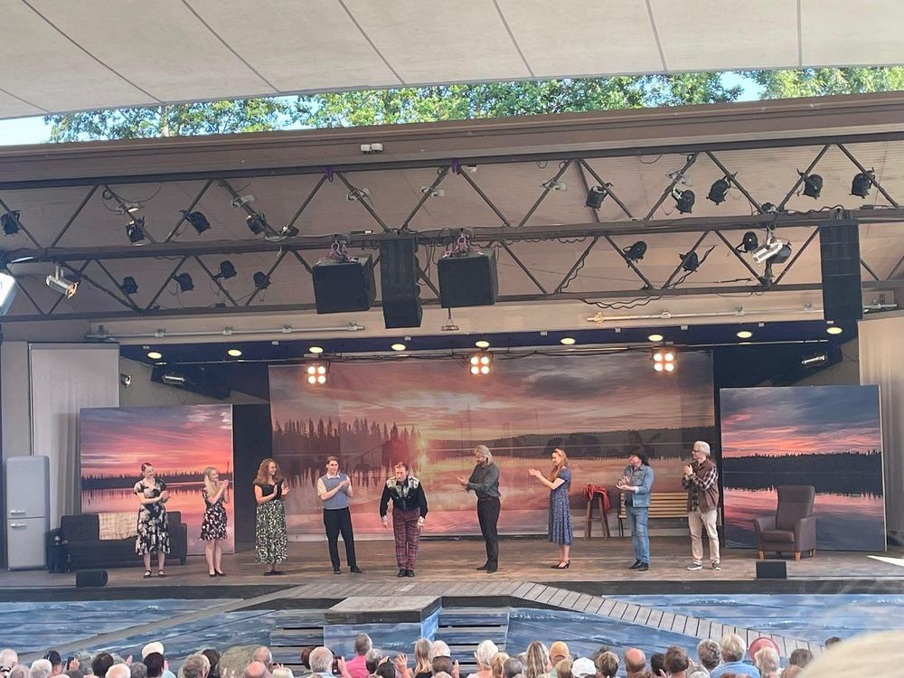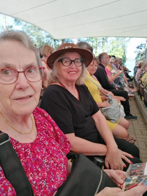 Lounaalta siirryimme kesäteatteriin ja siellä vasta olikin busseja, taisi kaikkiaan olla kymmenkunta. Pienen jaloitteluhetken jälkeen siirryimme katsomoon, joka täyttyi ääriään myöten ”senioreista”. Koska teatteri sijaitsee aivan järven rannalla, kävi siellä pieni tuulenvire ja olotila helteestä huolimatta ihan ok.